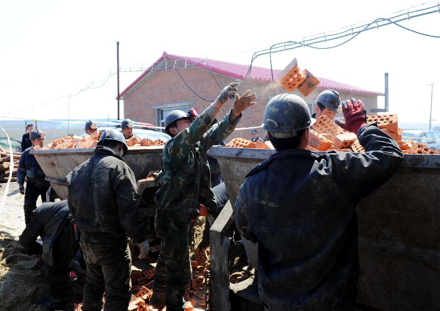 Rescuers carry relief supplies at the Junyuan No. 2 Coal Mine in the Xing'an District of the Hegang City, northeast China's Heilongjiang Province, May 4, 2012. Ten people have been confirmed dead as the result of a flood in the coal mine, as one body was retrieved early Friday morning, the local emergency rescue headquarters said. Efforts to rescue another four trapped miners are ongoing. (Xinhua/Wang Song)