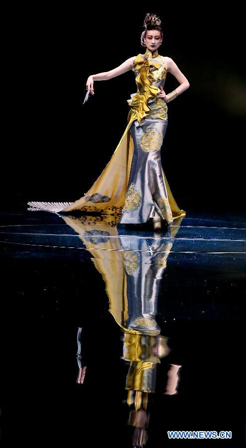 A model presents a creation of designer Guo Pei at the fashion show Dragon's Story in Beijing, capital of China, May 6, 2012. China's top dress designer Guo Pei released her latest fashion creations on Sunday. (Xinhua/Chen Jianli)