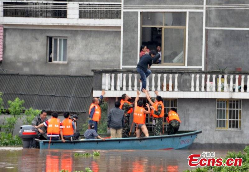 Rescuers try to relocate the trapped residents in Yanmen Township, Mayang County, central China's Hunan Province, May 9, 2012. The deluge strikes 369 towns in Hunan, affecting more than 1.2 million residents. [CFP Photo]