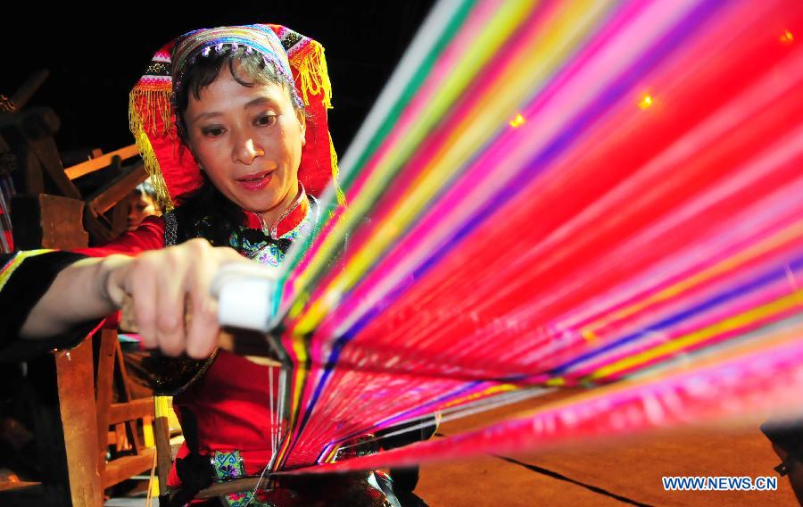 A woman of Yao ethnic group shows her weaving skills at Fengxi Village in Fuchuan Yao Autonomous County, southwest China's Guangxi Zhuang Autonomous Region, May 13, 2012. Efforts have been made in recent years to promote traditional culture of Yao ethnic group, as the folk culture plays important role in boosting tourism. (Xinhua/Huang Xuhu)