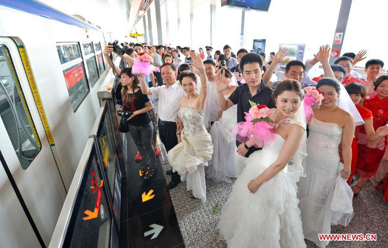 Newlyweds gesture to passengers at a light rail station in Chongqing Municipality, southwest China, May 20, 2012. Altogether 20 couples held a group wedding on a light rail train in Chongqing on May 20, a day which has a partial tone of "I love you" in Chinese. [Photo: Xinhua/Liu Chan]
