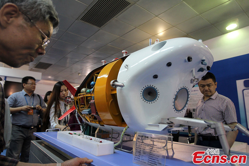A model of the "Jiaolong" submarine is on display. The 15th China Beijing International High-tech Expo kicked off today at the China International Exhibition Center (old center). There are 12 themed exhibition halls, which are open to the public for free. The show will conclude on May 27. [Photo: CNS/Jin Shuo]