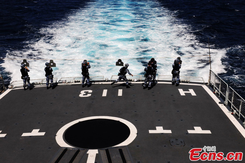 Special force soldiers of the 11th Chinese naval escort flotilla mount exercises during their trip to carry out escort missions. [Photo: CNS/Mi Jinguo]