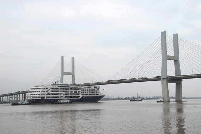 The luxury cruise ship Pearl No. 7, bumps a bridge in Wenzhou, East China's Zhejiang Province, May 23, 2012. No injuries were reported, but the deluxe liner lost its chimney which left a mark on Wenzhou Bridge. The cruise was being dragged by four tugboats to a downtown terminal ahead of opening to the public during the National Day holidays in October. The accident is believed to have been caused by miscommunications of the ship's height, Wenzhou City News reported. [Photo: CFP]