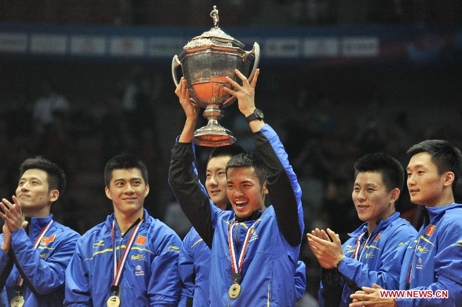 China's Lin Dan (3rd R) helds up the trophy during the award ceremony for the Thomas Cup world badminton team championships in Wuhan, central China's Hubei Province, on May 27, 2012. China defeated South Korea 3-0 to claim the title. (Xinhua/Guo Chen)