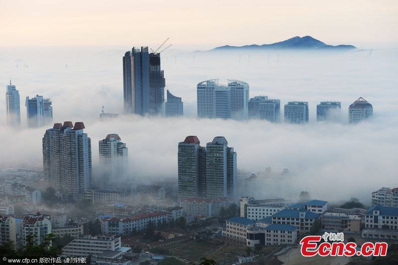Spectacular advection fog occurs in Yantai City, east China's Shandong Province, May 31, 2012. Advection fog is the result of condensation- moist warm air passes over a cool surface by advection (wind) and is cooled. [CFP Photo]