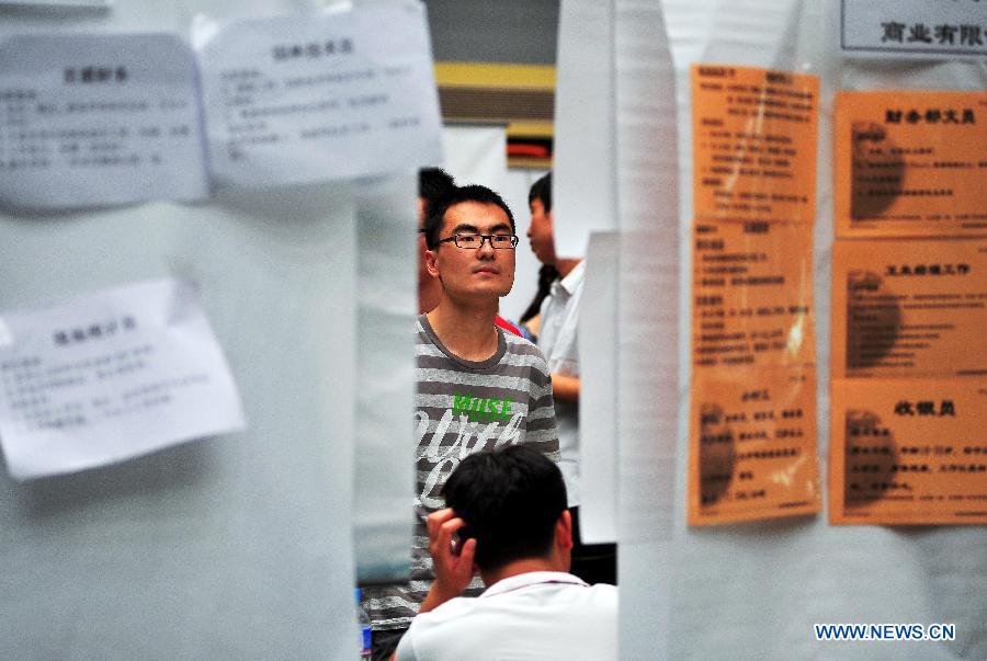 A student of Tianjin University seeks internship opportunities during a summer internship fair in north China's Tianjin Municipality, June 3, 2012. The summer internship fair, held by Tianjin University on Sunday, attracted some 180 enterprises and institutions and nearly 2,000 students looking for internship opportunities. (Xinhua/You Sixing)