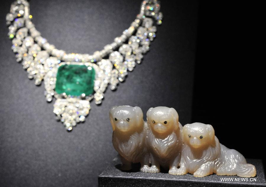 Photo taken on June 7, 2012 shows jade-made labrador sculptures made in 1907 during a preveiw of "Royal Style: Qing Dynasty and Western Court Jewelry" exhibition held at the Taipei Palace Museum in Taipei, southeast China's Taiwan. The exhibition, which will be held from June 9 to September 9, is composed of about 475 pieces of jewelry from the collection of the Taipei Palace Museum, the Shenyang Palace Museum and the Cartier Collection. (Xinhua/Wu Ching-teng)
