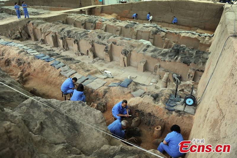 Photo taken on June 9, 2012 shows part of the newly unearthed relics at No.1 pit of the Museum of Qin Shi Huang Terracotta Warriors and Horses in Xi'an, capital of northwest China's Shaanxi Province. [CNS Photo/Zhang Yuan]