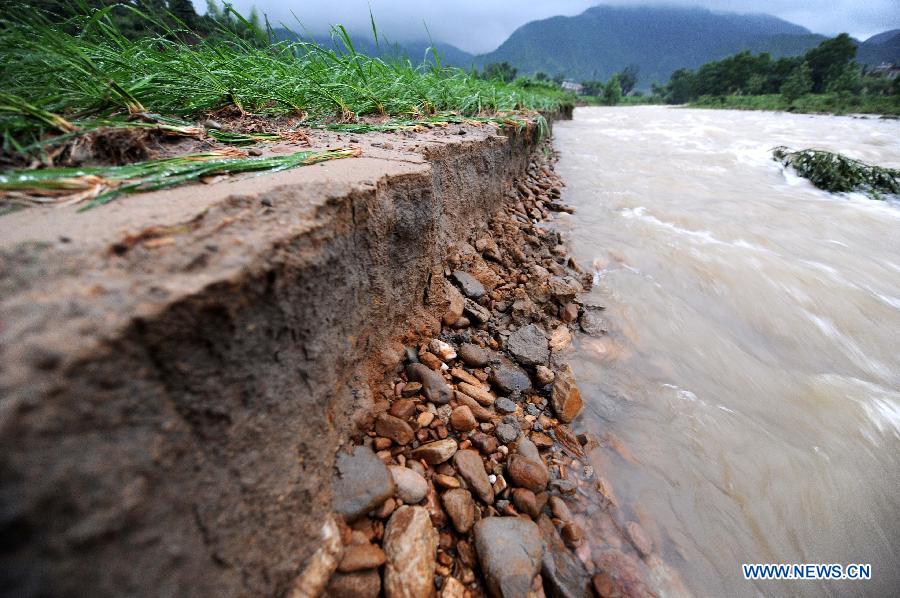 A levee on the Xietang River is washed away by a flood that struck Suichuan County, east China's Jiangxi Province, June 11, 2012. Torrential rains which occurred in most parts of Jiangxi Province since June 8 have affected some 300,000 local residents. The province has transferred 3,340 residents threatened by floods as of Monday morning. (Xinhua/Zhou Ke)