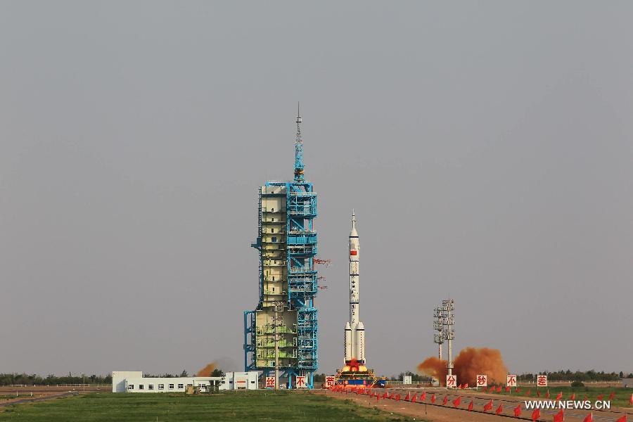 The Long March-2F rocket carrying China's manned Shenzhou-9 spacecraft blasts off from the launch pad at the Jiuquan Satellite Launch Center in Jiuquan, northwest China's Gansu Province, June 16, 2012. (Xinhua/Li Gang)