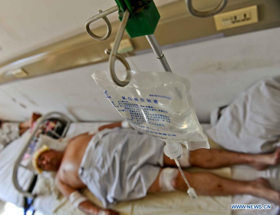 An injured person receives treatment in a hospital in Shuangcheng City, northeast China's Heilongjiang Province, June 27, 2012. At least 13 people were injured in an explosion at a cafeteria in Shuangcheng on Wednesday. (Xinhua/Wang Song)
