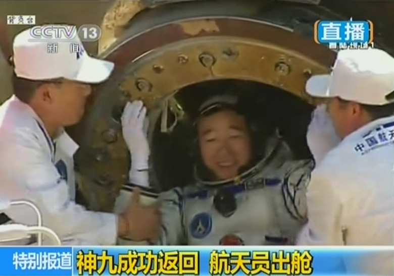 This screen shot taken on June 29, 2012 shows astronaut Jing Haipeng exits the reentry capsule of China's Shenzhou-9 spacecraft in Siziwang Banner of north China's Inner Mongolia Autonomous Region. The Shenzhou-9 spacecraft landed safely in Inner Mongolia's Siwangzi Banner on Friday morning.
