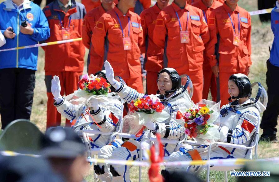 Photo taken on June 29, 2012 shows Chinese astronauts Jing Haipeng (C), Liu Wang (L) and Liu Yang sitting in chairs after coming out of the re-entry capsule of Shenzhou-9 spacecraft in Siziwang Banner of north China's Inner Mongolia Autonomous Region. (Xinhua/Zhang Ling)
