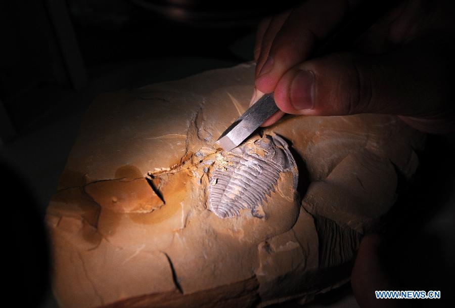 Archaeologist clean a trilobite fossil at Chengjiang animal fossile museum in Chengjiang County, southwest China's Yunnan Province, July 1, 2012. The Chengjiang Fossil of China was included into the World Heritage List at the 36th World Heritage Conference held in St. Petersburg, Russia on Sunday. (Xinhua/Qin Qing)