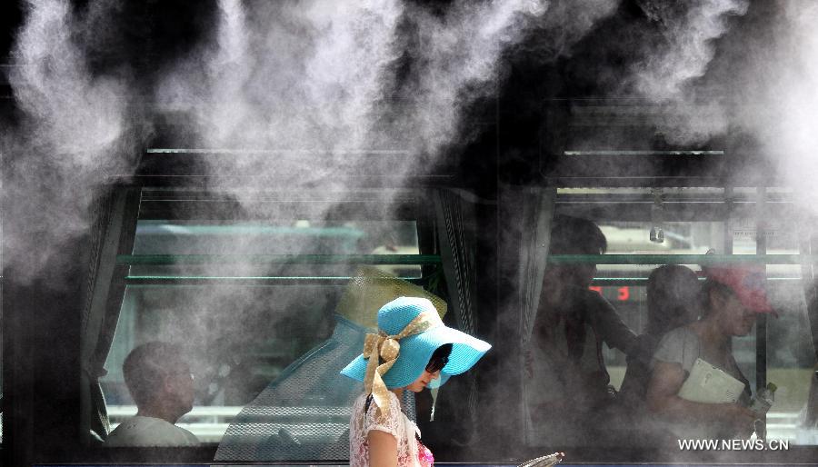 A passenger is seen under spraying equipment at the Lingyin bus station in Hangzhou, capital of east China's Zhejiang Province, July 2, 2012. The spraying equipment of the station was turned on to create a comfortable waiting condition for passengers in hot weather. (Xinhua/Wu Huang)