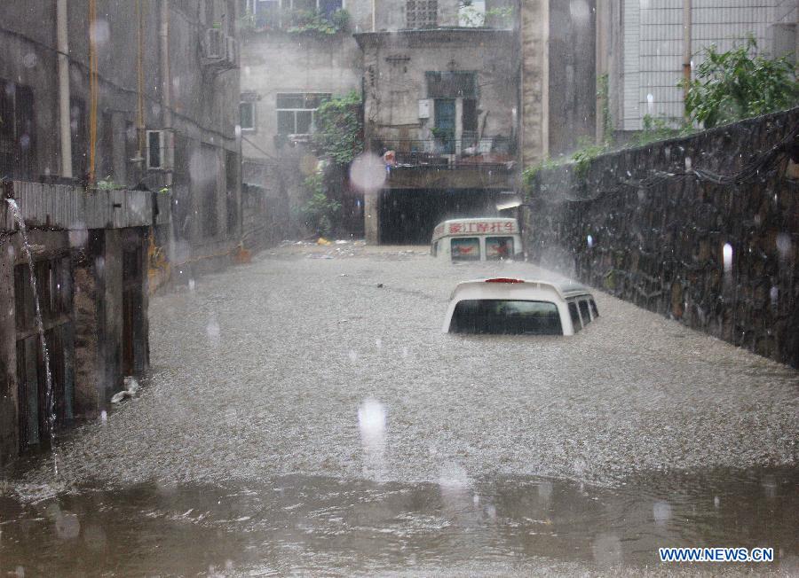 Vehicles are submerged in Wangyuan City of Dazhou, southwest China's Sichuan Province, July 4, 2012. Rain storms since June 30 have killed three people and affected more than 620,000 people in Dazhou City, local authorities said Monday. The rain storms also destroyed 2,419 houses and damaged another 5,529 dwellings in the city, an official of Dazhou municipal government said. (Xinhua/Deng Liangkui)
