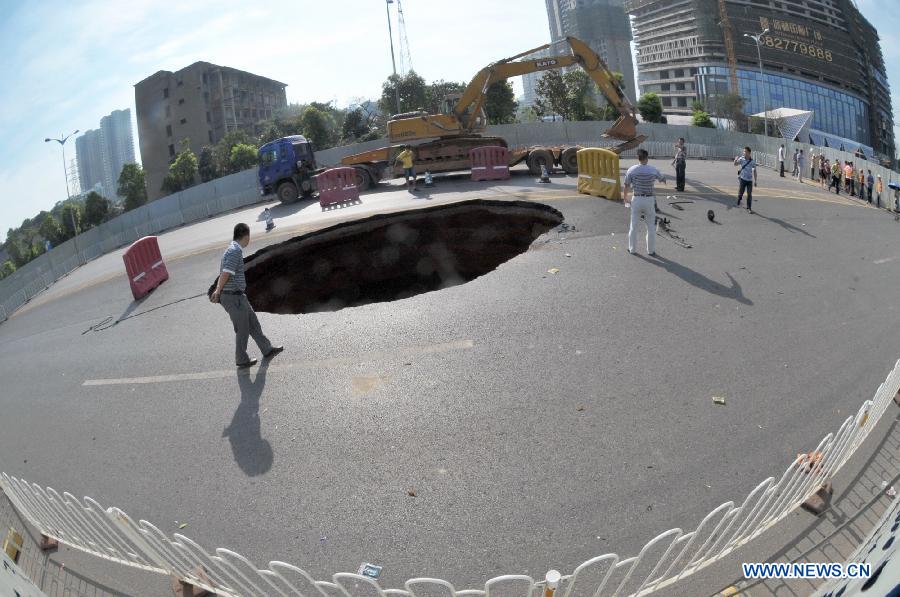 Photo taken on July 5, 2012 shows a collapse site in Changsha, capital of central China's Hunan Province. A section of Xiangjiang Road running near Xiangjiang River in Changsha caved in early Thursday, engulfing a passing vehicle and killing at least one person aboard. The cave-in, near the Poly International Plaza, created a 30-square-meter pit on the road. (Xinhua/Long Hongtao)