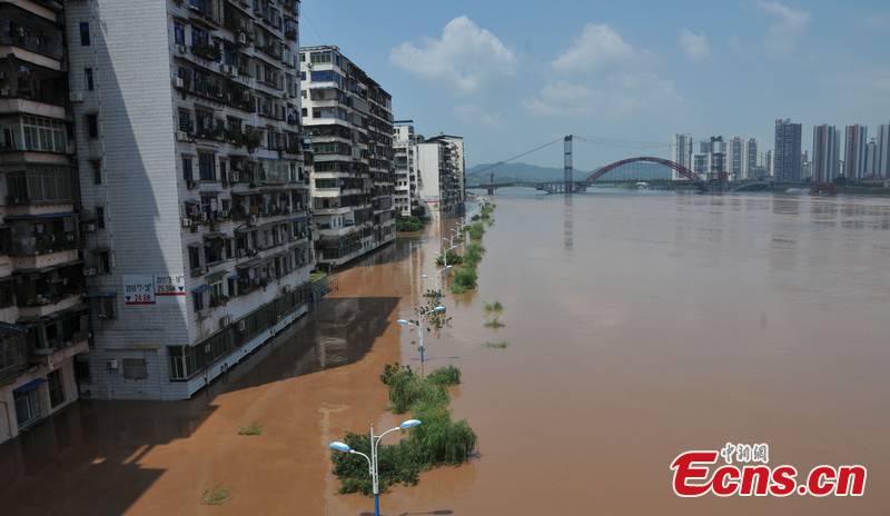 The flood crest caused by torrential rains arrives Dazhou, southwest China's Sichuan Province, flooding streets and damaging buildings, July 5, 2012. The storm flooding has affected 505,900 people throughout the county. [CNS Photo/Wu Tao]