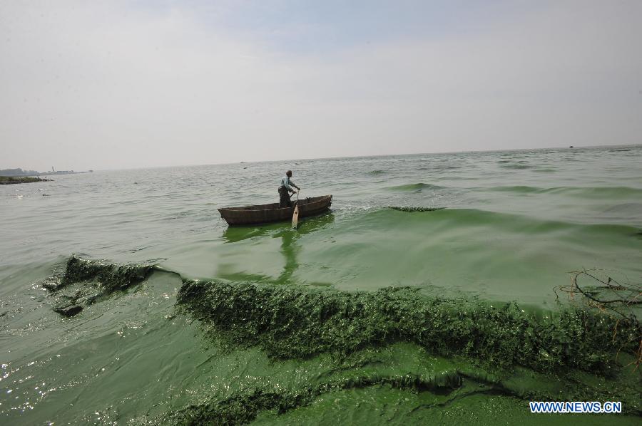 A fisherman paddles in the water of the Chaohu Lake, east China's Anhui Province, July 8, 2012. Blue-green algae gathered in Chaohu Lake recently due to the rising temperature. (Xinhua/Yang Xiaoyuan)