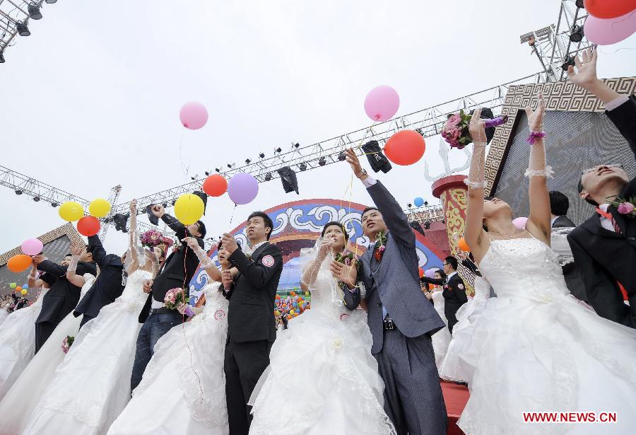 Couples poses for group photos at Zhangbei grassland in Zhangbei County of north China's Hebei Province, July 7, 2012. Some 100 newly wed couples enjoy their matrimonial ceremony here Saturday. (Xinhua/Zhang Yu)