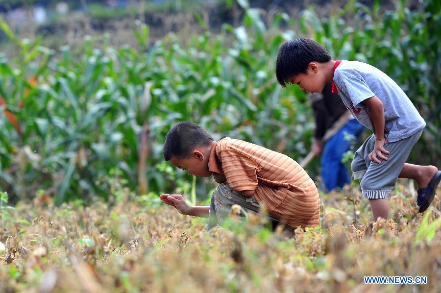 Qin Xiaohui (R) and his brother catch cricket in Banlie Village of Bansheng Township in Dahua Yao autonomous County, south China's Guangxi Zhuang Autonomous Region, July 5, 2012. The six-year-old Qin Xiaohui is a left-behind child, who lives in the Banlie Village with his brother, grandfather and grandmother. On July 4, Qin graduated from the preschool. He enjoys the summer vacation with playmates and helps his grandfather and grandmother to do some farm work every day. Sometimes, the intelligent boy misses his parents working in the downtown. (Xinhua/Huang Xiaobang)