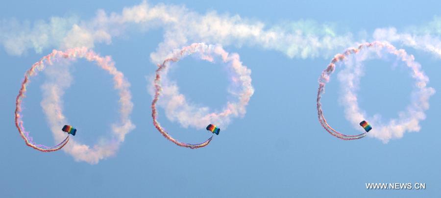 Members of the Bayi Parachute Team of the Chinese People's Liberation Army (PLA) Air Force gives a performance in Xi'an, capital of northwest China's Shaanxi Province, July 11, 2012. (Xinhua/Li Yibo)