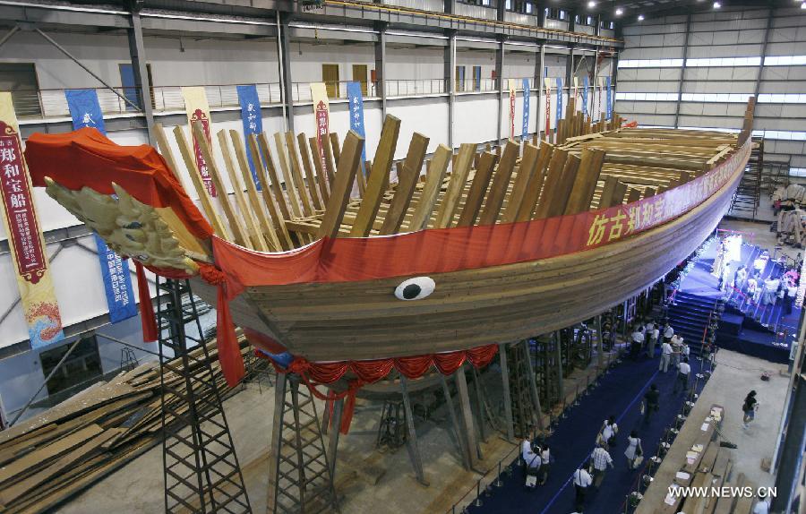 Photo taken on July 12, 2012 shows the interior of the replica of "Zheng He Treasure Ship" under construction in Nanjing, capital of east China's Jiangsu Province. The replica of "Zheng He Treasure Ship," which is designed to be six-masted, 71.1 meters long and 14 meters wide with a displacement of 1,800 tonnes, is scheduled to complete installation in 2012 and start debut sailing in 2014. Treasure Ships are used by the commander of the fleet during the voyages of Zheng He, who made seven voyages to more than 30 countries and regions in Asia and Africa from 1405 to 1433 in the Ming Dynasty (1368-1644). (Xinhua/Wan Xiang)