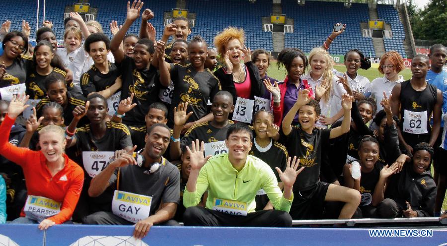 China's star hurdler Liu Xiang (bottom C) and Tyson Gay (bottom L3) of USA pose for a group photo with fans one day before the IAAF Diamond League London Grand Prix at Crystal Palace stadium in south London, Britain, July 12, 2012. (Xinhua/Wang Zijiang)