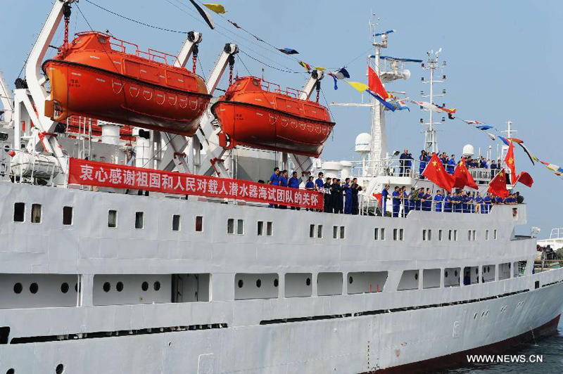 Xiangyanghong-9 ship which carries China's manned submersible Jiaolong arrives in Qingdao, East China's Shandong Province, July 16, 2012. China's manned submersible Jiaolong has successfully completed its program of deep sea dives, with a sixth and final dive to 7,000 meters in the Mariana Trench in the Pacific Ocean on June 30. (Xinhua/Yu Fangping)