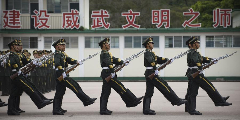 The honor guards of the Chinese People's Liberation Army (PLA) Garrison in the Hong Kong Special Administrative Region (HKSAR) perform on the opening ceremony of Hong Kong Youth Military Summer Camp at the San Wai Barracks of the Garrison in south China's Hong Kong, July 16, 2012. (Xinhua/Lui Siu Wai)