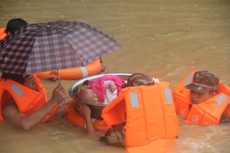 Fire fighters rescue a trapped baby with a bason in Xieqiao Village of Bijiang District in Tongren, Southwest China's Guizhou Province, July 16, 2012. A rain-triggered flood hit the village Monday, and rescuers have transferred all the six trapped persons. (Xinhua/Liu Yonggang)