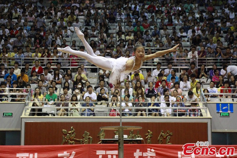 Students watch acrobatic show during the break of a training class, July 16, 2012. Some 3,500 people, who plan to take the national graduate school entrance examination in 2013, attended the large-scale training class in an indoor stadium in Jinan, the capital city of Shandong Province, July 16, 2012. [Photo: IC Press]