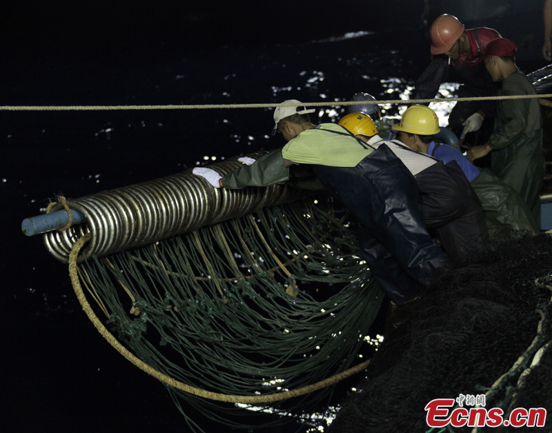 China's largest ever fishing fleet begins fishing in the Nansha Islands in the South China Sea, as of Monday night. The fleet, including a 3,000-ton supply ship and 29 ships weighing more than 140 tonnes each, arrived in waters around the Yong-shu Reef on Sunday, after a 78-hour voyage from Hainan Province. They'll spend the next five to ten days fishing in these waters. [Photo: CNS/Wang Ziqian]
