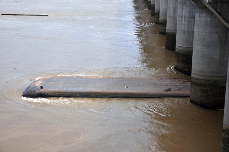 A capsized barge is seen afloat in the Liujiang River near the Honghua Hydro-Power Station in Liujiang County, South China's Guangxi Zhuang Autonomous Region, July 18, 2012. One of the deck crew is still missing after a sand barge capsized here on Tuesday. The ship has six crew members on board. (Xinhua)