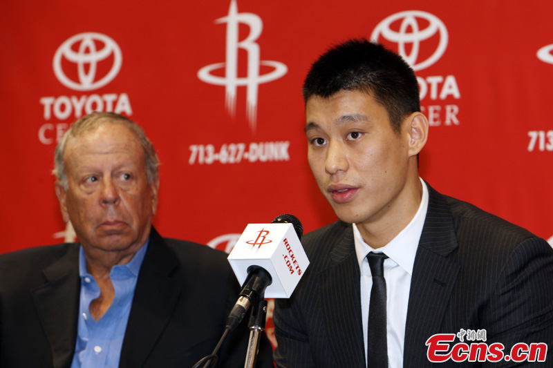 Jeremy Lin is officially introduced as a Houston Rocket at a news conference in Houston, July 19, 2012. [Photo: CNS/Jia Zhong]