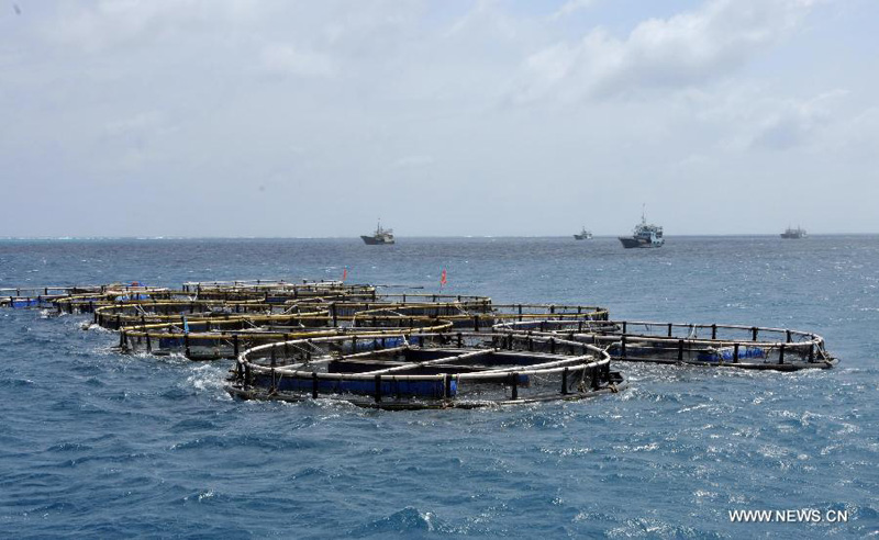 A fish farm is seen in the waters at Meiji Reef of South China Sea on July 22, 2012. There are nearly a score of fishermen working at the farm regularly. (Xinhua/Wang Cunfu)