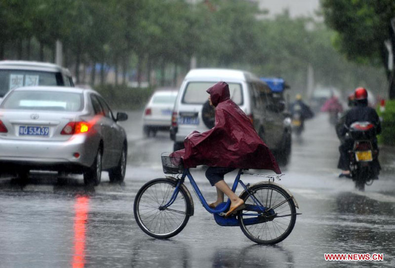 A citizen rides a bike while vehicles move against rainstorm on a street in Yangjiang, south China's Guangdong Province, July 24, 2012. Typhoon Vicente landed in Chixi Town of Taishan City in Guangdong early Tuesday. (Xinhua/Chen Yehua)
