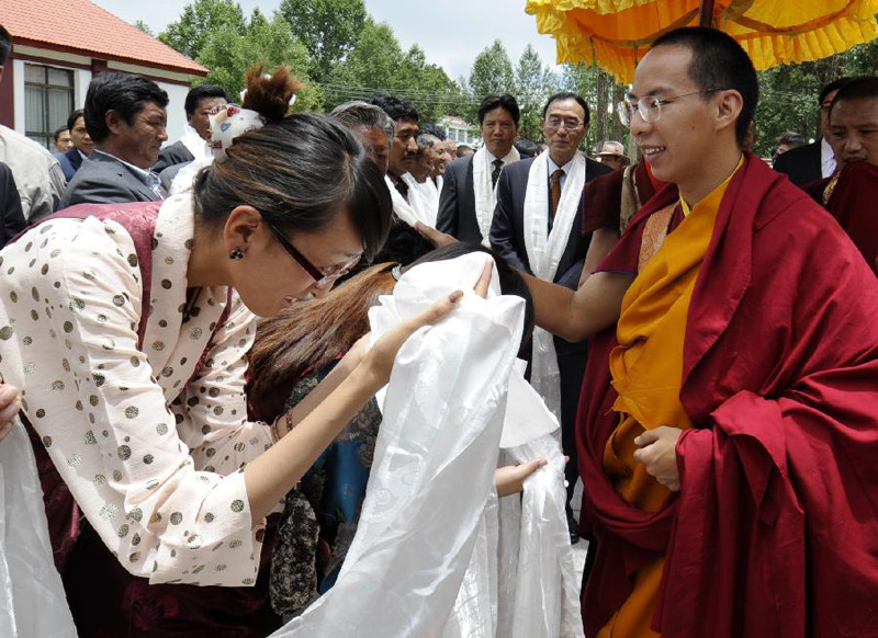 The 11th Panchen Lama, Bainqen Erdini Qoigyijabu (R), is greeted after arriving in Lhasa, capital of southwest China's Tibet Autonomous Region, July 23, 2012. The Panchen Lama began his Lhasa visit on Monday. The lama's visits have become an annual event in recent years. (Xinhua/Chogo)