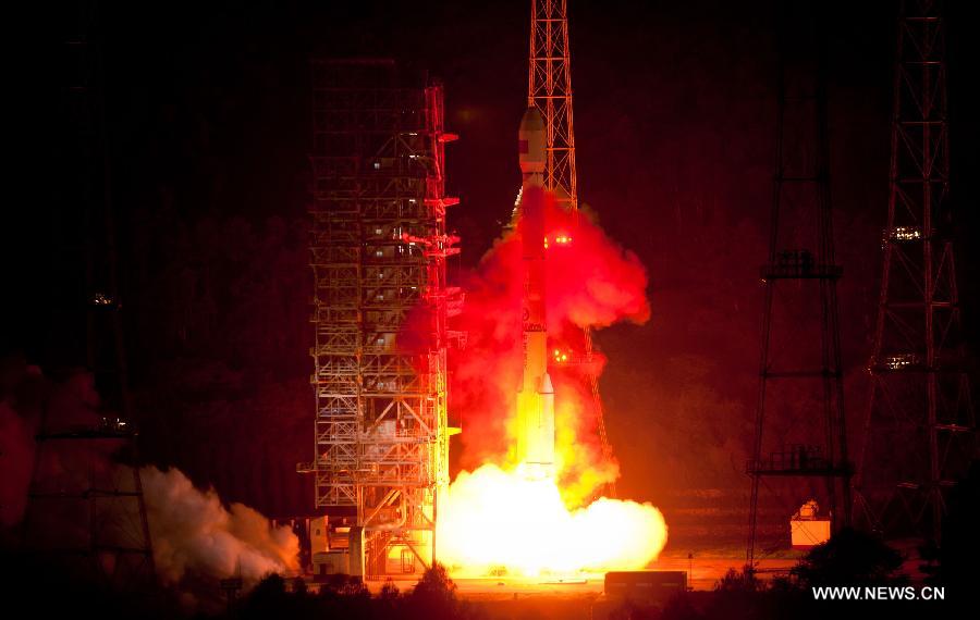 The Long March-3C carrier rocket carrying the Tianlian I-03 satellite blasts off from the Xichang Satellite Launch Center in Xichang, southwest China's Sichuan Province, July 25, 2012, completing the country's first data relay satellite network system. The satellite will join its two predecessors to realize global network operation after in-orbit validation and system coordination procedures are carried out. The first data relay satellite, the Tianlian I-01, was launched in April 2008, and the second was launched in July 2011. The third satellite is expected to improve the network's coverage in providing measurement and control services for China's manned spacecraft as well as the planned construction of future space labs and space stations, according to the center. The network will also offer data relay services for the country's medium- and low-Earth orbits as well as measurement and control support for spacecraft launches. (Xinhua/Jiang Hongjing)