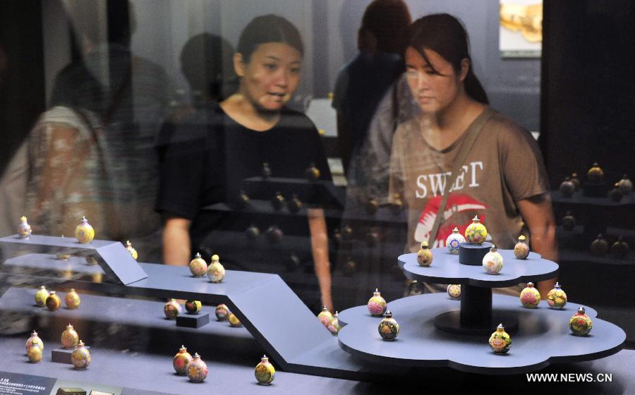 Photo taken on July 25, 2012 shows visitors admiring exquisite snuff bottles in the Palace Museum in Taipei, southeast China's Taiwan. The exhibition "Lifting the Spirit and Body: The Art and Culture of Snuff Bottles" kicked off in Taipei Palace Museum Wednesday. The display includes various snuff boxes and bottles as well as related paraphernalia, especially reflecting how the ancient Chinese court responded to the European fashion of snuff to create a unique culture of snuff bottles. (Xinhua/Wu Ching-teng)