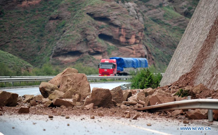 Rain-triggered landslide disrupts traffic in NW China (1/3)