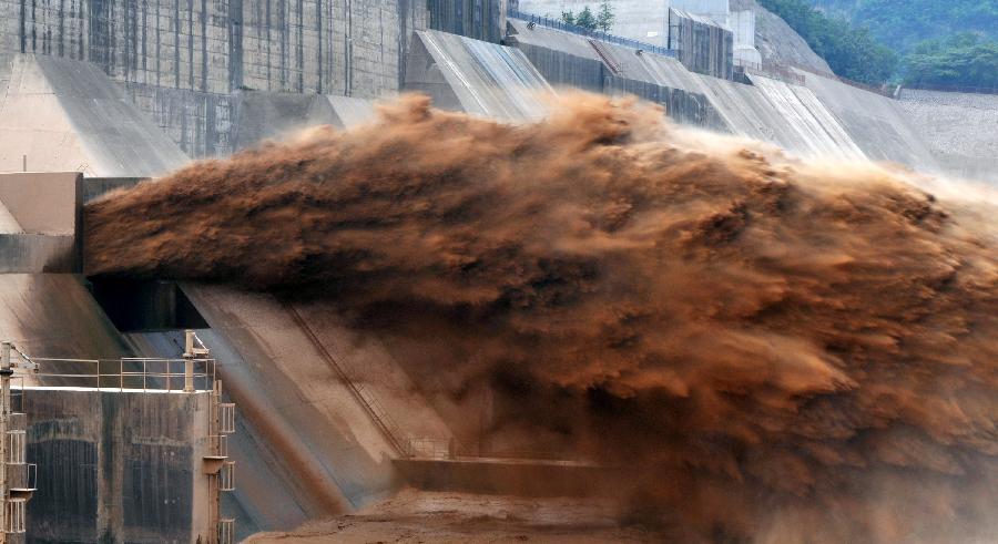 Sediment-laden water gushes out from the Xiaolangdi Reservoir on the Yellow River during a flood peak adjustment operation in central China's Henan Province, July 30, 2012. A flood peak arrived at the Xiaolangdi Reservoir on Monday. (Xinhua/Li Bo)