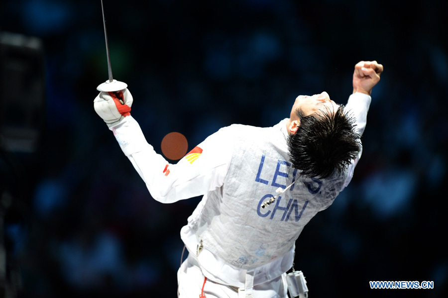 Lei Sheng of China celebrates after defeating Alaaeldin Abouelkassem of Egypt in men's fencing Foil individual gold medal match, at London 2012 Olympic Games in London, Britain, July 31, 2012. (Xinhua/Guo Yong)