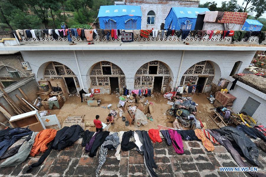 Photo taken on Aug. 1, 2012 shows the waterlogged clothes hanging in a villager's house after rainstorms in Wujiawan Village of Linxian County, north China's Shanxi Province. Torrential rains lashed Linxian county on July 26 and July 27, damaging roads and telecommunications facilities. Eight people have been confirmed dead, twenty-two others injured and two remain missing so far. The direct economic loss reached 1.3 billion yuan (about 204 million U.S. dollars). (Xinhua/Zhan Yan)