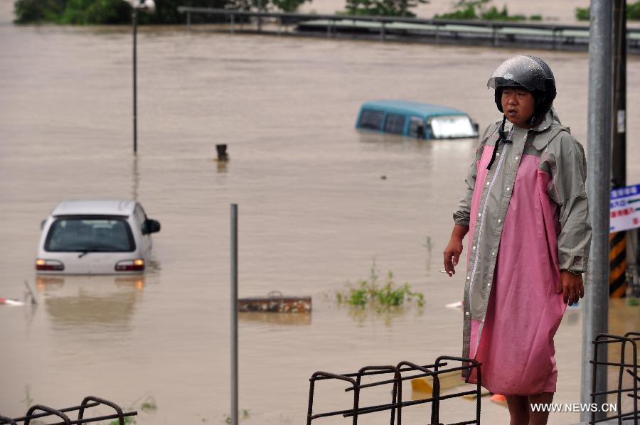 A citizen looks at the half-submerged cars in Xinbei City, southeast China's Taiwan, Aug. 2, 2012. Typhoon Saola brought heavy rains around Taiwan, forcing most of the island's schools and offices to close Thursday.(Xinhua)