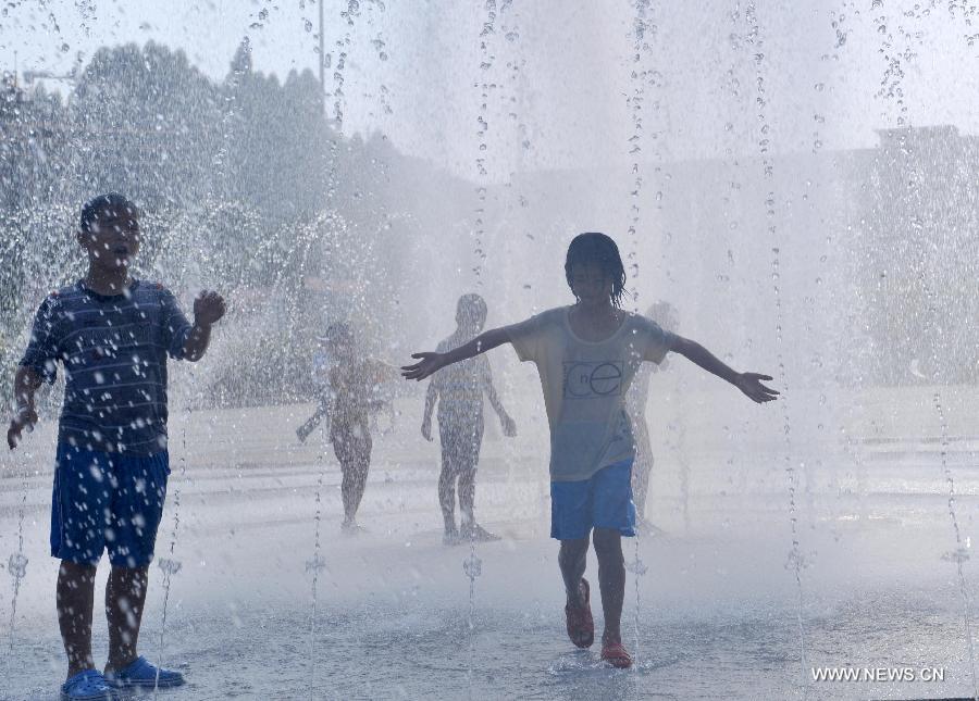 Children play at a fountain to relieve summer heat in Songhe Park in Luchuan County, southwest China's Guangxi Zhuang Autonomous Region, Aug. 2, 2012. A heat wave continued to hit Guangxi Thursday. (Xinhua/Zhou Hua)