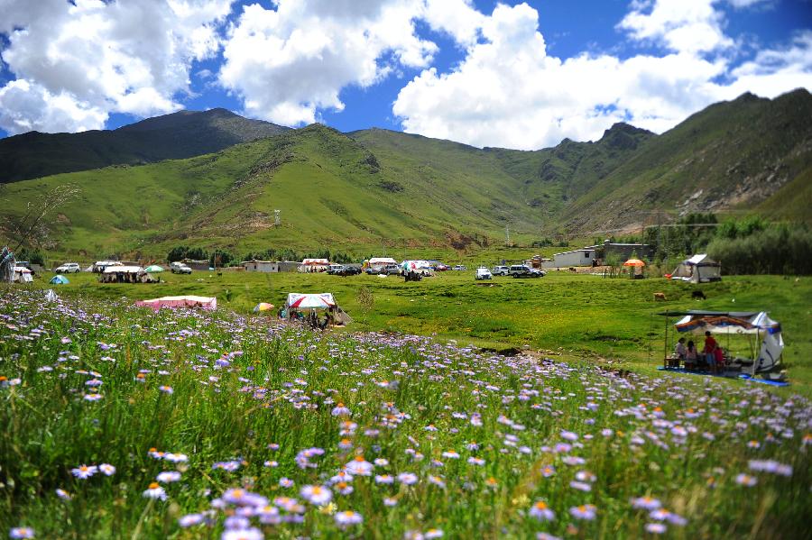 People of the Tibetan ethnic group enjoy themselves in tents while having an outing on the outskirts of Lhasa, capital of southwest China's Tibet Autonomous Region, Aug. 5, 2012. (Xinhua/Wen Tao)