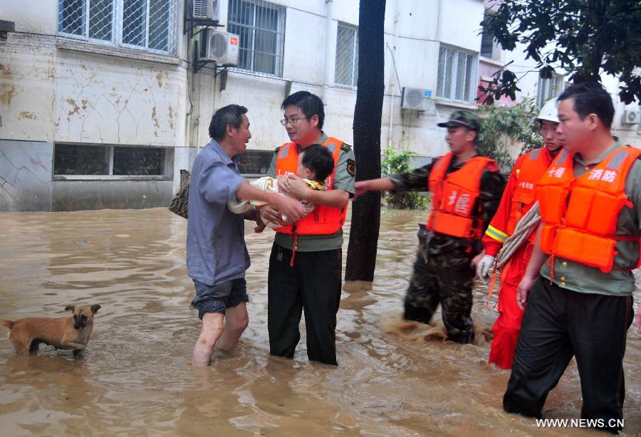 Firefighters rescue trapped people in Shiyan, central China's Hubei Province, Aug. 6, 2012. Thirteen people were dead and three others remain missing after a strong rainstorm battered the city of Shiyan from Saturday night to Monday morning. Maximum precipitation surpassing 400mm has triggered floods and landslides in the city, affecting 120,000 households, the municipal government said. (Xinhua/Cao Zhonghong)