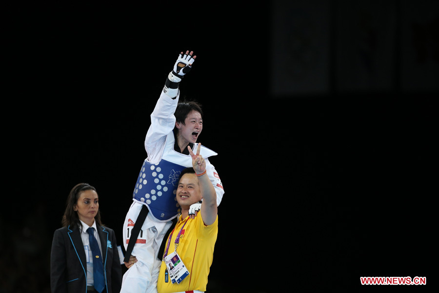 China's Wu Jingyu (C) celebrates after winning Brigitte Yague Enrique of Spain during women's -49 kg taekwondo gold medal match at London 2012 Olympic Games, London, Britain, Aug. 8, 2012. Wu Jingyu won the match 8-1 and won gold medal in this event. (Xinhua/Wang Lili)